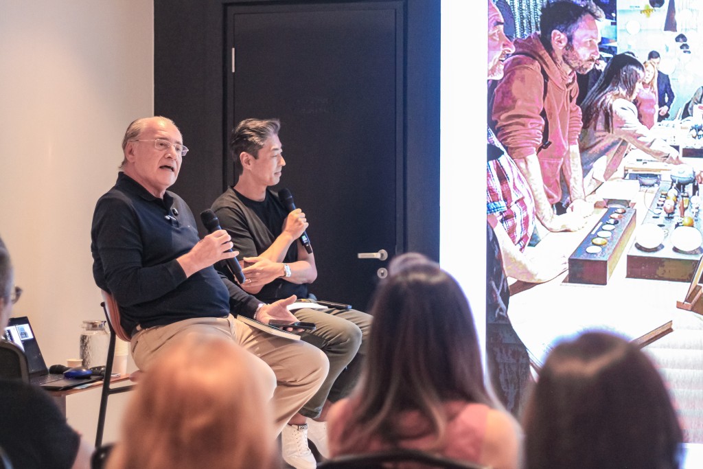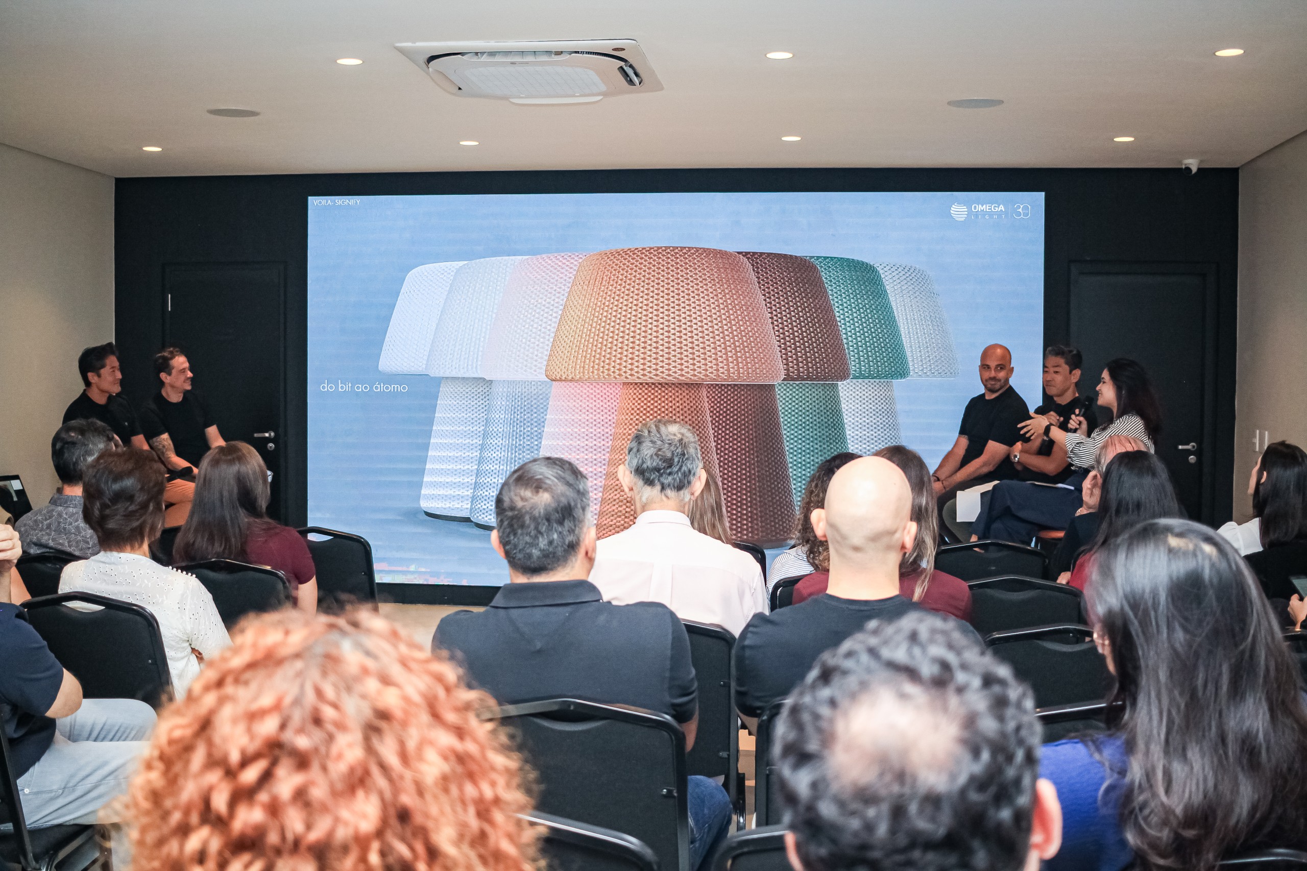 O omega insights pós l+b, realizado em 08/04, foi estruturado em dois momentos principais. O evento contou com dois talks que condensaram aprendizados e provocaram novas reflexões: o primeiro conduzido pelo nosso time, os quatro representantes que estiveram presentes na feira, e o segundo promovendo uma troca entre três lighting designers que também visitaram a Light+Building 2026: Antônio Carlos Mingrone (Mingrone Iluminação), Guinter Parschalk (Studio IX) e Livia Berriel (Franco+Berriel).