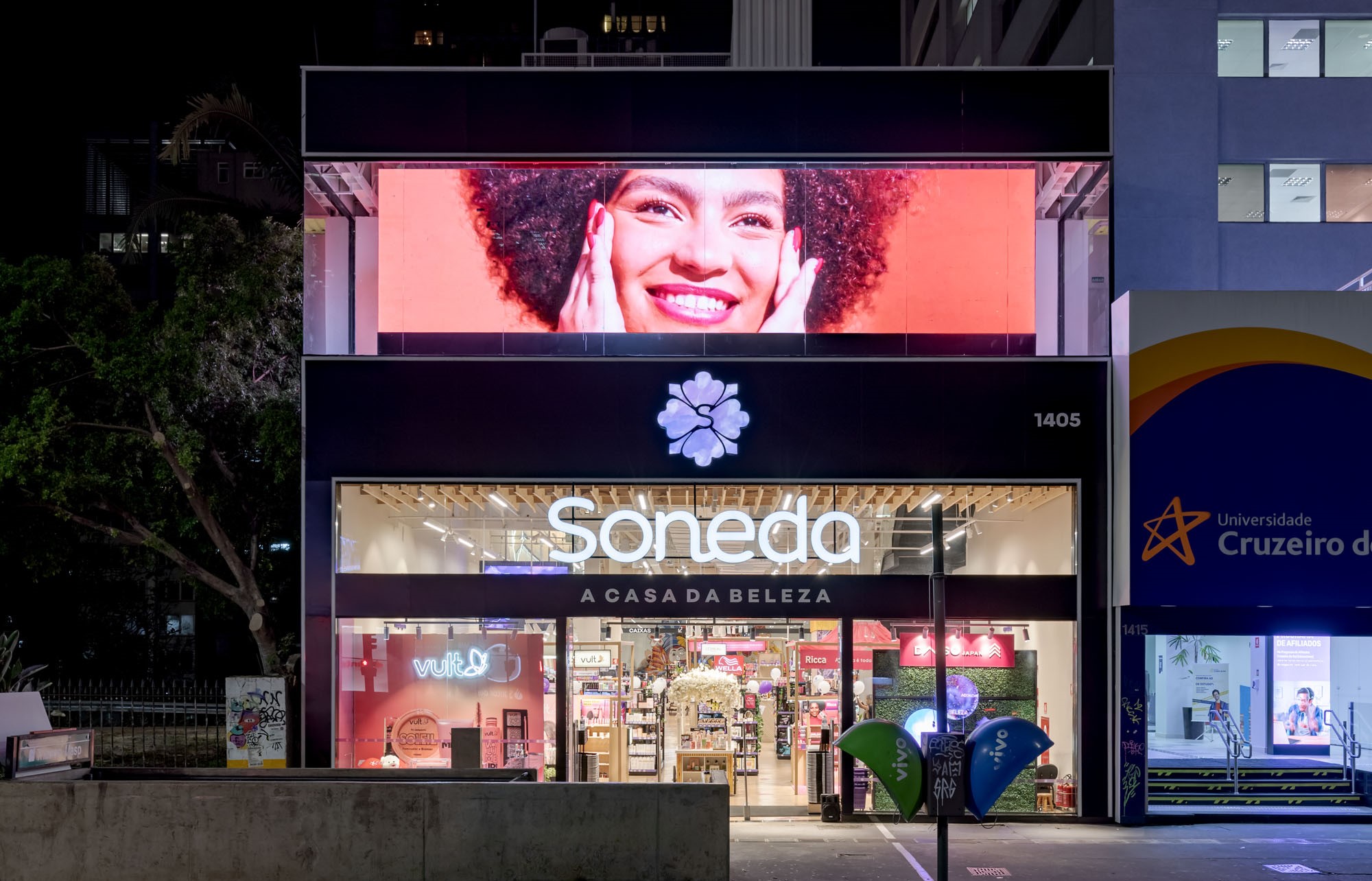 Soneda: É uma loja que se destaca por seu design minimalista e elegante. Para reforçar esse conceito, a iluminação foi projetada para destacar a arquitetura clean do local, realçando as texturas e as formas do espaço. A luz foi usada de forma estratégica para criar uma atmosfera aconchegante e moderna, fazendo com que os clientes se sentissem em um ambiente acolhedor, mas ao mesmo tempo sofisticado.